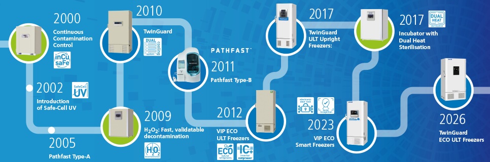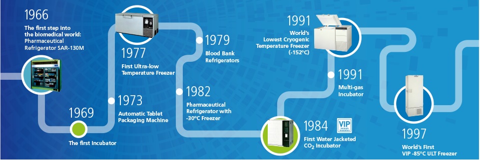 PHC 生醫事業始於1966年,當時三洋電機(SANYO Electric Co., Ltd.)開發並推出用於藥品冷藏的醫療用冰箱。此後,透過研發、生產及銷售各類研究與醫療支援設備——包括培養箱、超低溫冷凍設備及冷藏產品——該事業持續為生命科學研發品質的提升以及臨床現場作業效率的改善做出貢獻。