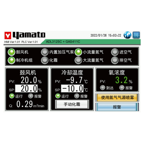 控制面板 : LCD觸控螢幕,可切換中/英/日文顯示,可控制冷凝溫度、鼓風機風量、噴霧氣源切換、氧濃度。