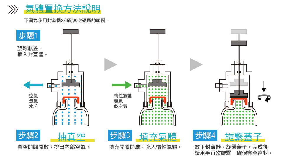 氣體置換裝置與封蓋器可讓您快速輕鬆地用惰性氣體替換容器內的氣體,而無需佔用手套箱或乾燥器的空間。