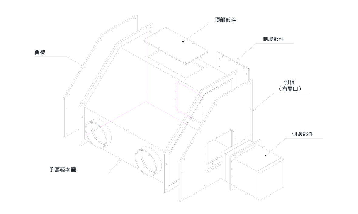 .頂部部件透過手套箱本體上的螺絲孔固定,因此我們建議在完成側面部件和側板的安裝後,再安裝它們。